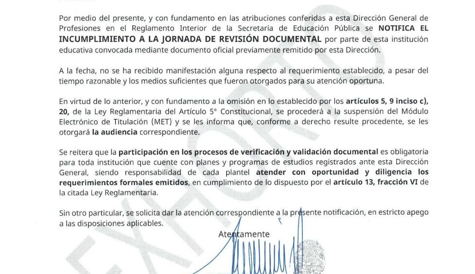 Paradójicamente, al final de cada oficio, después de la amenaza de bloqueo, aparece una frase recurrente donde prácticamente se les dice “tiene usted derecho de audiencia y podemos platicar”, porque ese es el mensaje del exhorto que dice: “se procederá a la suspensión del Módulo Electrónico de Titulación (MET) y se les informa que conforme a derecho resulte procedente, se les otorgará la audiencia correspondiente”, firmado por Israel Jerónimo López, director de Autorización y Registro Profesional. Para las universidades, esta frase ilustra el doble discurso institucional: primero se paralizan los trámites y después se ofrece un diálogo tardío, condicionado y carente de efectos reales.