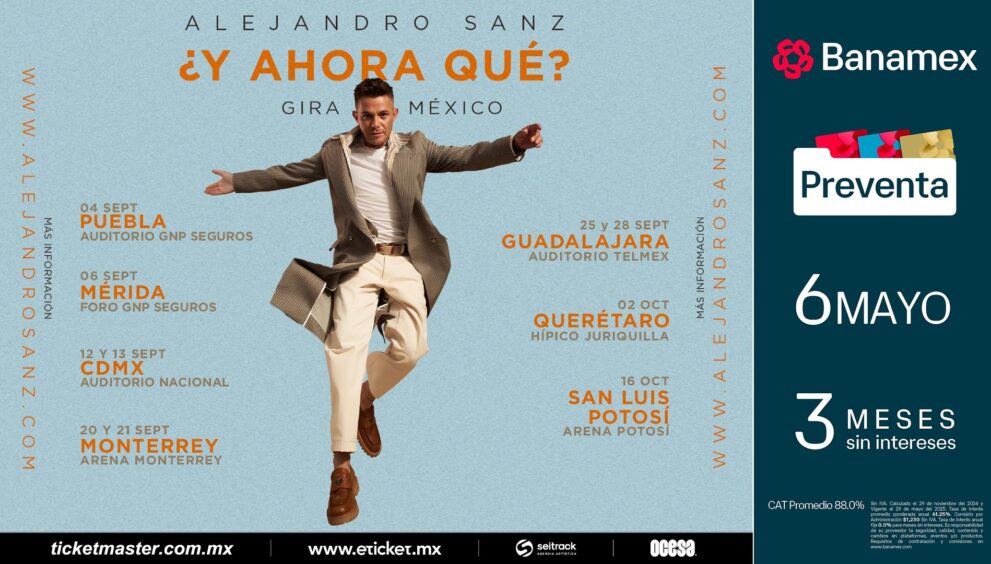 Esta nueva gira, ¿Y Ahora Qué? en México, es una oportunidad única de escuchar en vivo temas atemporales y los nuevos éxitos del artista español. Los boletos estarán en Preventa Banamex a partir del 6 de mayo; la venta general será un día después en las taquillas del inmueble y a través de Ticketmaster, así como en Eticket.