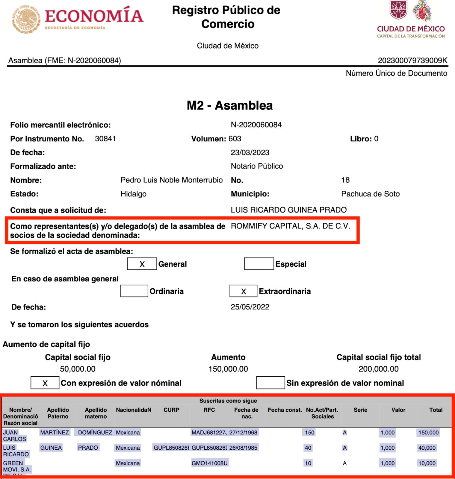 Según documentos oficiales, Rommify Capital SA de CV fue constituida el 02 de octubre 2020 ante la fe de la Notaria Pública No. 21, María del Consuelo García Curiel, de Pachuca, siendo los socios originales la persona física Luis Ricardo Guinea Prado, y el otro socio es la razón social Green Movi SA de CV, una empresa que fue ampliamente beneficiada con contratos por más de 250 millones de pesos en la administración de Fayad Meneses.