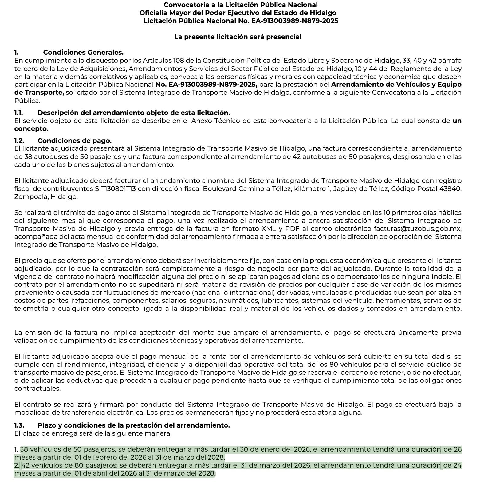 Pese a ello, la convocatoria para Licitación Pública Nacional EA-913003989-N879-2025, fue publicada el pasado 27 de noviembre de 2025 por la Oficialía Mayor del Gobierno de Hidalgo para el arrendamiento de 80 autobuses: 42 de 80 pasajeros, y 38, de 50 pasajeros, que se sumaran a la flotilla del Sistema Integrado de Transporte Masivo de Hidalgo (SITMAH).