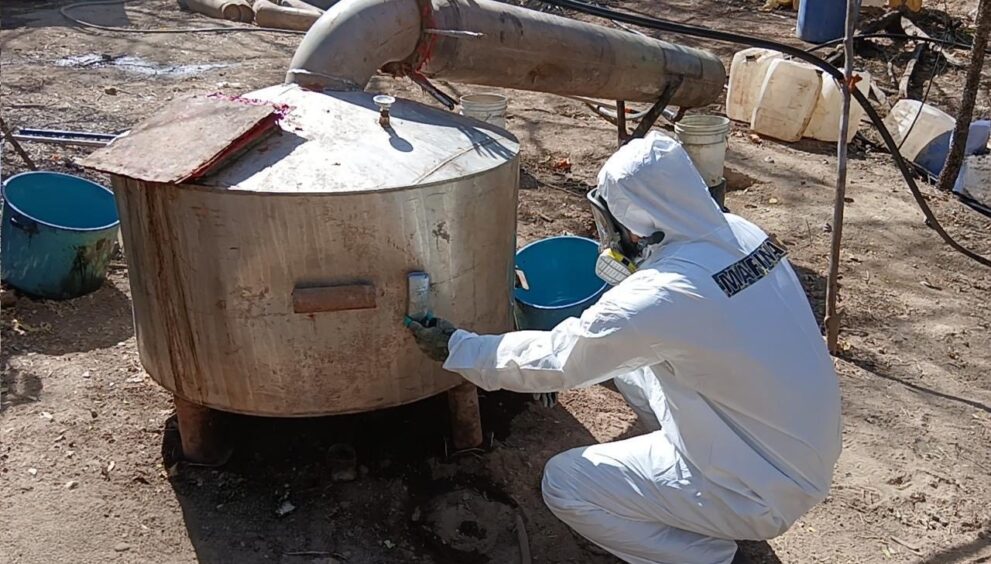La Secretaría de Marina desmanteló tres laboratorios clandestinos para la elaboración de metanfetaminas en Michoacán, Durango y Sinaloa, donde se aseguraron más de 700 kg de metanfetamina, así como 12,000 litros y dos toneladas de precursores químicos”, señaló a través de su cuenta oficial en X.
