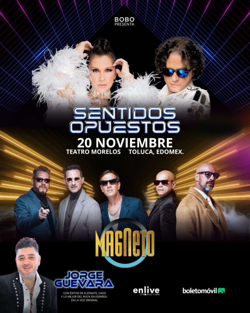 Los boletos ya están a la venta en Boletomóvil, invitando a los amantes del pop y del rock latino a asegurar su lugar en esta cita imperdible. La cita es el jueves 20 de noviembre a las 8:00 p.m. en el Teatro Morelos de Toluca, una noche donde Sentidos Opuestos, Jorge Guevara y Magneto unirán sus voces para recordarnos que los grandes éxitos nunca se despiden: simplemente esperan el momento justo para volver a emocionar. Una velada donde la música será memoria viva, y el público, testigo de que los sueños de los noventa aún saben cantar.