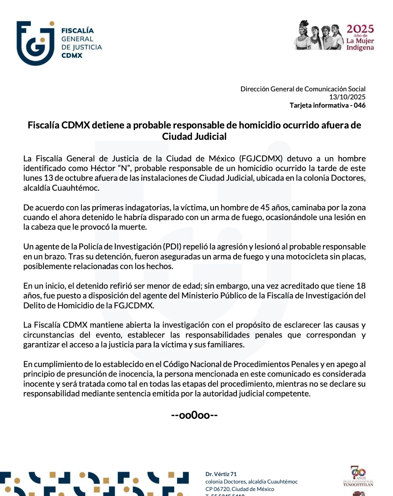 Un joven de 18 años, identificado como Héctor “N”, le disparó con un arma corta a la cabeza. El litigante fue trasladado a un hospital, donde falleció más tarde, confirmó la Fiscalía General de Justicia de la Ciudad de México (FGJCDMX).