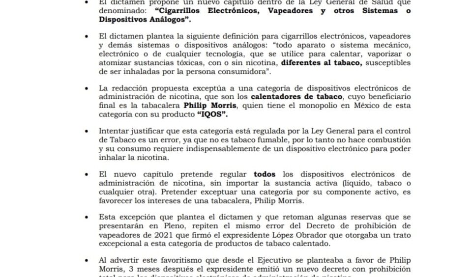 La reforma a la Ley General de Salud que prohíbe vapeadores y regula dispositivos electrónicos de nicotina. Sin embargo, el dictamen ha generado críticas por dejar fuera a los calentadores de tabaco, categoría controlada en México únicamente por Philip Morris con su producto IQOS. El análisis técnico del propio Legislativo advierte que esta excepción reproduce el mismo favoritismo que motivó en 2021 la corrección del decreto presidencial que inicialmente les daba trato especial.