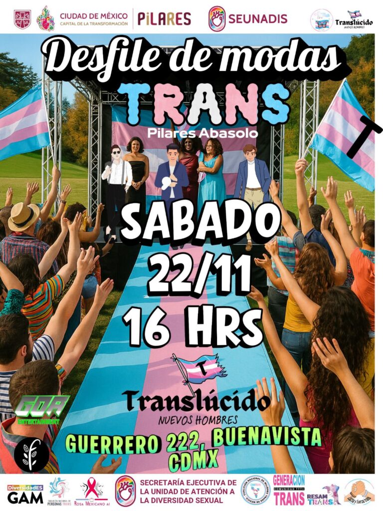 El sábado 22 de noviembre se vivirá uno de los momentos más luminosos de la jornada: el Desfile de Modas Translúcido: porque lo Trans ¡Luce!, a las 16:00 horas en PILARES Abasolo, ubicado en Guerrero 222, Buenavista. Bajo la organización y visión de Neidan Macías, este encuentro celebra la identidad, el talento y la presencia de las personas trans desde la estética, el arte, la historia y el cuerpo.