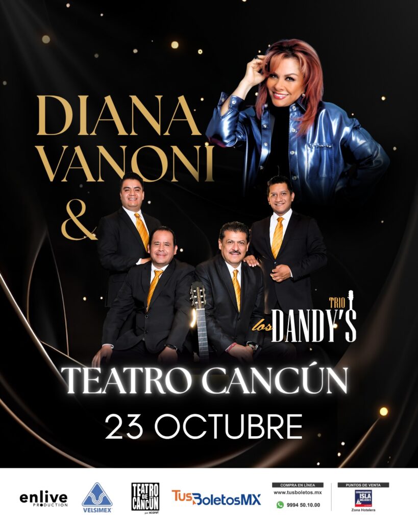 La reconocida intérprete mexicana Diana Vanoni ofrecerá un concierto muy especial este jueves 23 de octubre de 2025 en el Teatro de Cancún, en el corazón de Quintana Roo, a partir de las 8:30 de la noche, en una velada que además contará con la presencia del histórico Trío Los Dandys encabezado por Francisco Escamilla Jr. Los boletos ya se encuentran disponibles a través del sistema TusBoletos.mx y se anticipa una gran respuesta del público local y visitante, ávido de reencontrarse con dos estirpes de la canción romántica que han sabido conservar la elegancia del bolero y la emoción de la balada.